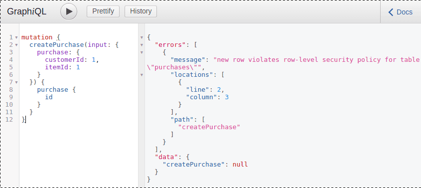}we expect this to fail due to a rls violation. to add a purchase, we needed to be an admin. sure enough, the query shows a "new row violates row-level security policy" error message:
