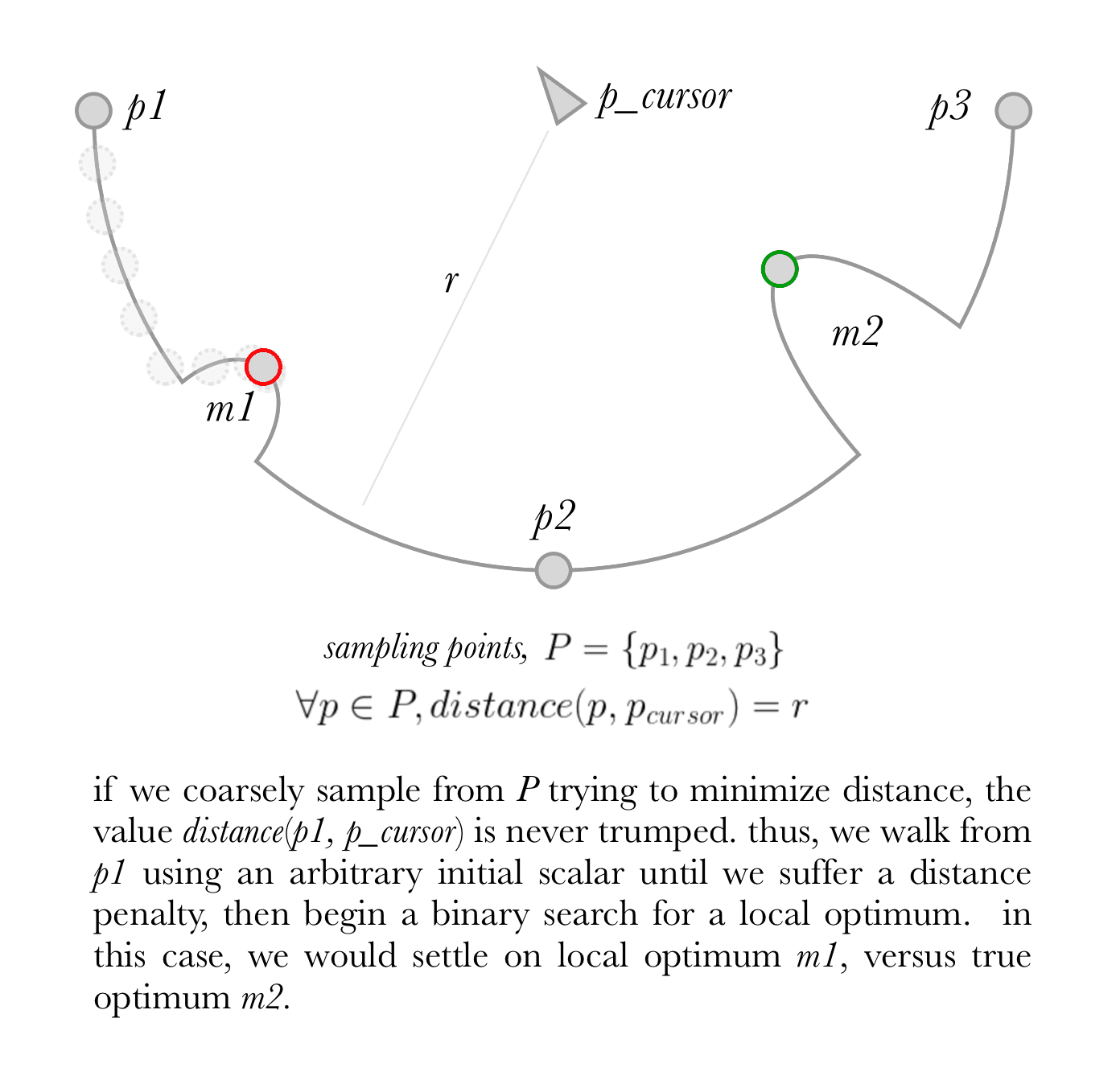 In our implementation, we sample ten times regardless of the path length, which is admittedly very coarse. If we use a small sampling length, increasing the path's length may induce performance penalties through excess distance calculations. As a counter point, the number of walk iterations also increases by keeping the coarse scan count value low. Math is art. Surely more fine tuning could be applied here, but one cannot describe a general, target geometry for all users' paths! I've found a fixed value of ten works well for this use case.